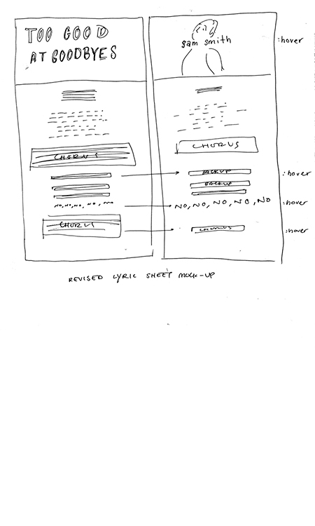 Originally I wasn't thinking about having the elements of the lyric sheet be that interactive because the song is pretty mellow. But I think because of the way the rhythm changes throughout, it would be nice to have the lyrics kind of expand and contract as you scroll through them.